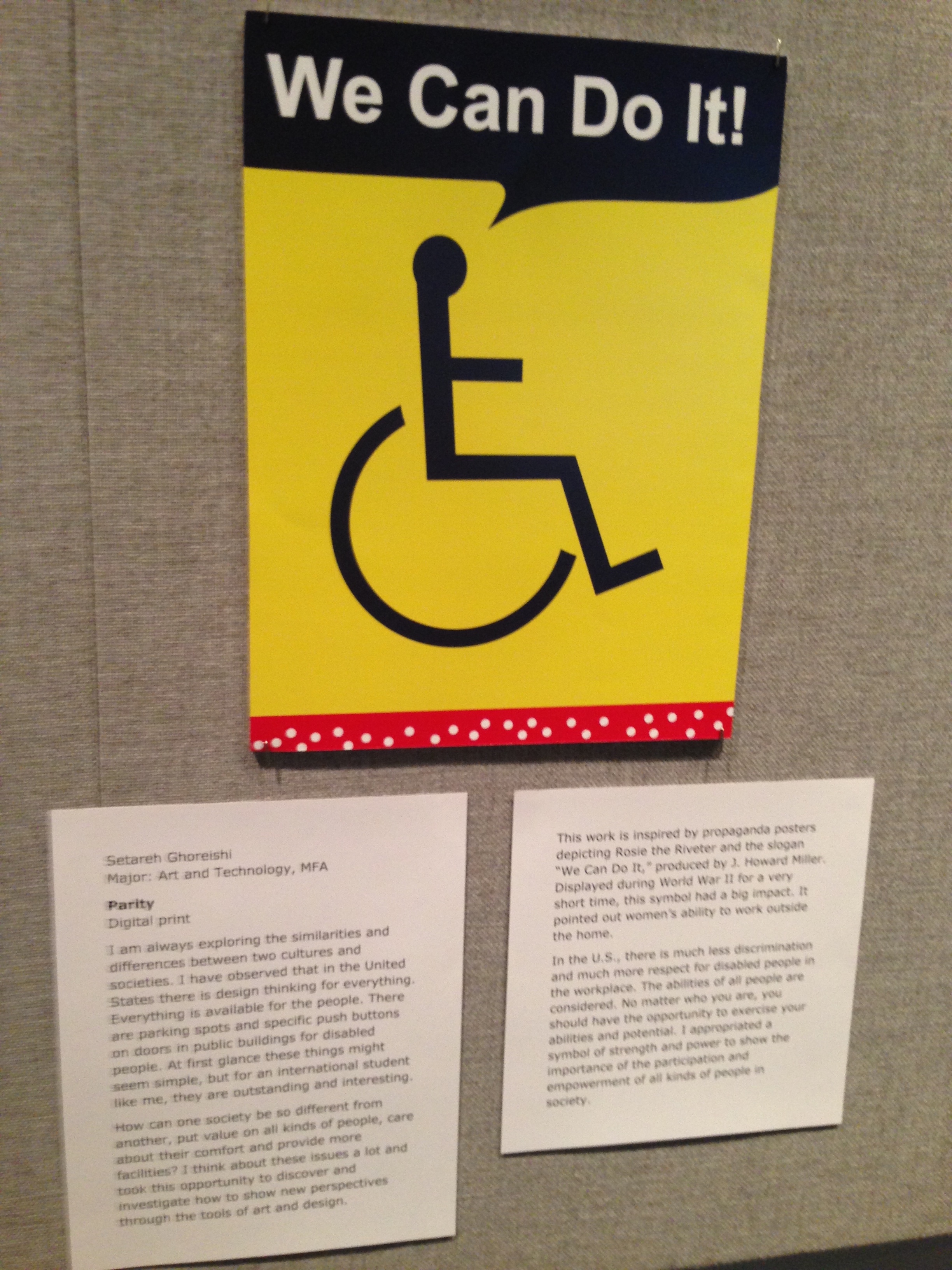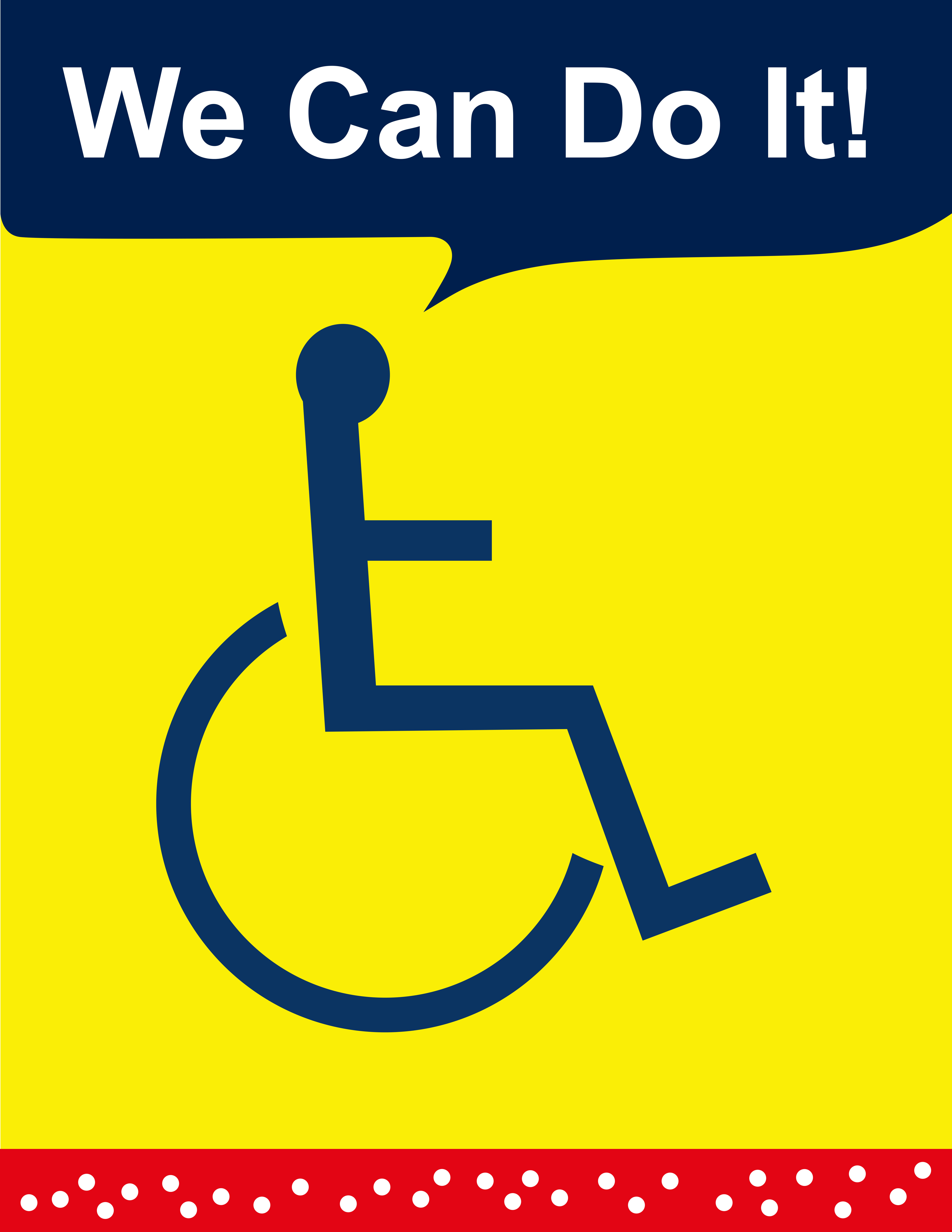 This work is inspired by propaganda posters depicting Rosie the Riveter and the slogan “We Can Do It,” produced by J. Howard Miller. Displayed during World War II for a very short time, this symbol had a big impact. The posters pointed out women’s ability to work outside the home. In the U.S., there is much less discrimination and much more respect for disabled people in the workplace. The abilities of all people are considered. No matter who you are, you should have the opportunity to exercise your abilities and potential.