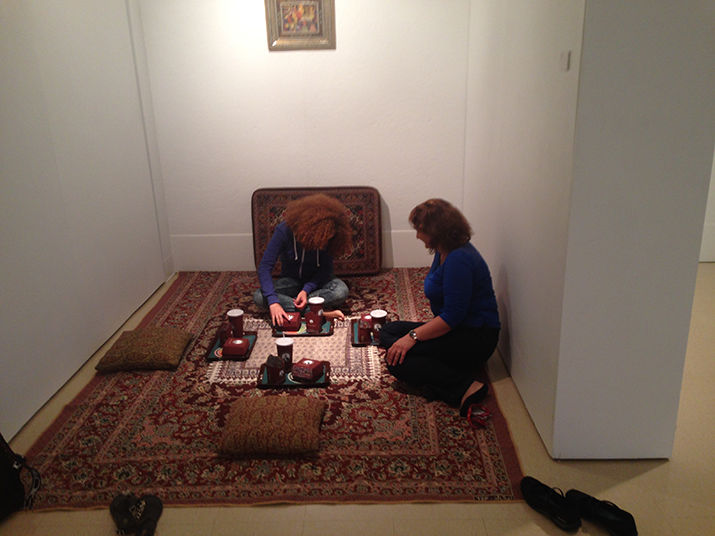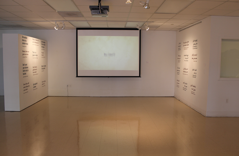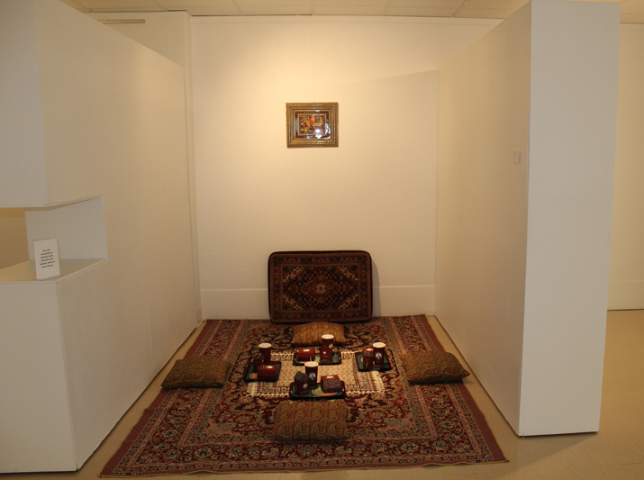 The fourth piece in the exhibition is a short 2-minute video entitled Tarof, which plays from a ceiling-mounted projector. This is a kinetic typography, animation video that tries to provide a basis for understanding this particular Iranian custom, which is subtle, and unclear to the outsider. Tarof is a traditional Iranian etiquette practice. It governs the way people act when offering food or consideration to others, buying or selling things and negotiating in conversation. this piece depicts humorous conversation between two people.One of them is a guest and the other one is the host. The host offers food to his guest, and gradually insists that he eat more and more to be sure that his guest is eating enough. Eventually this back and forth conversation causes annoyance and the guest wants to leave.