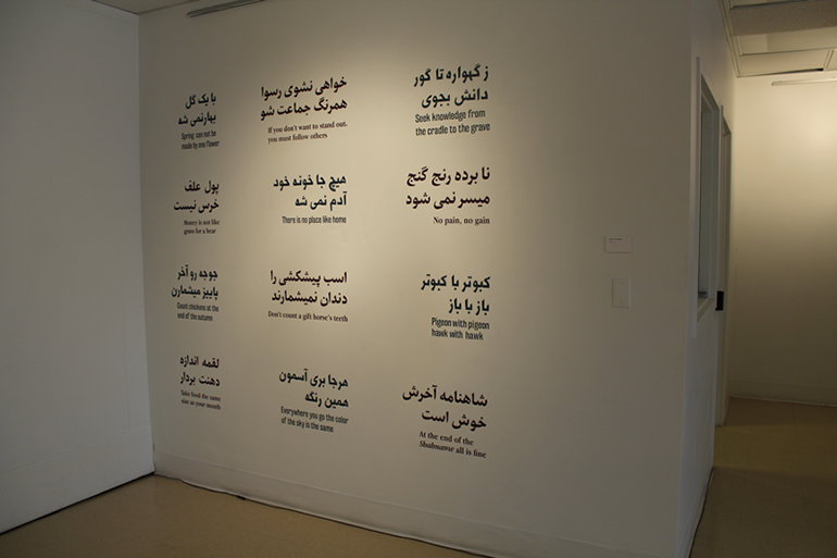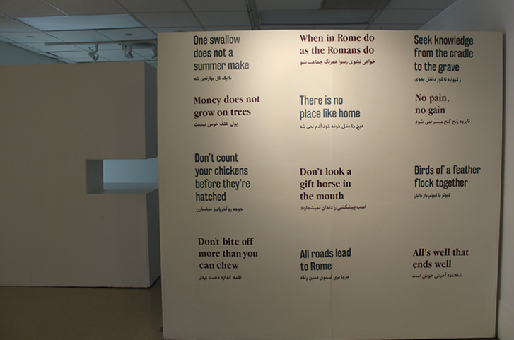 Birds of a Feather investigates the similarities and differences in proverbs and idioms in Iranian and American culture especially in folk language. This piece has variable dimensions, but is intended to be displayed on facing walls. Each wall has twelve idioms, made from cut vinyl in a process typical of commercial signage. I have placed western (largely American) idioms on one wall with the dominant type reading in English and its Farsi translation immediately below. On the opposite wall I have reversed the process by displaying Iranian idioms in Farsi along with their English translations. In this configuration the viewer can see and compare American idioms with the Persian equivalents. My intention is to show the similarities of tradition and thought expressed in all of its sameness and subtle difference so that audiences of both languages might see themselves reflected in the other. Using the letterforms of the two languages employs graphic design to convey messages that can be a bridge between the two cultures.