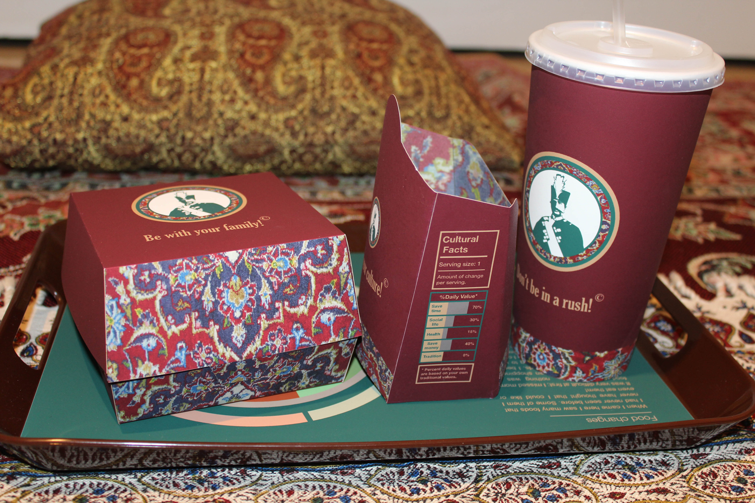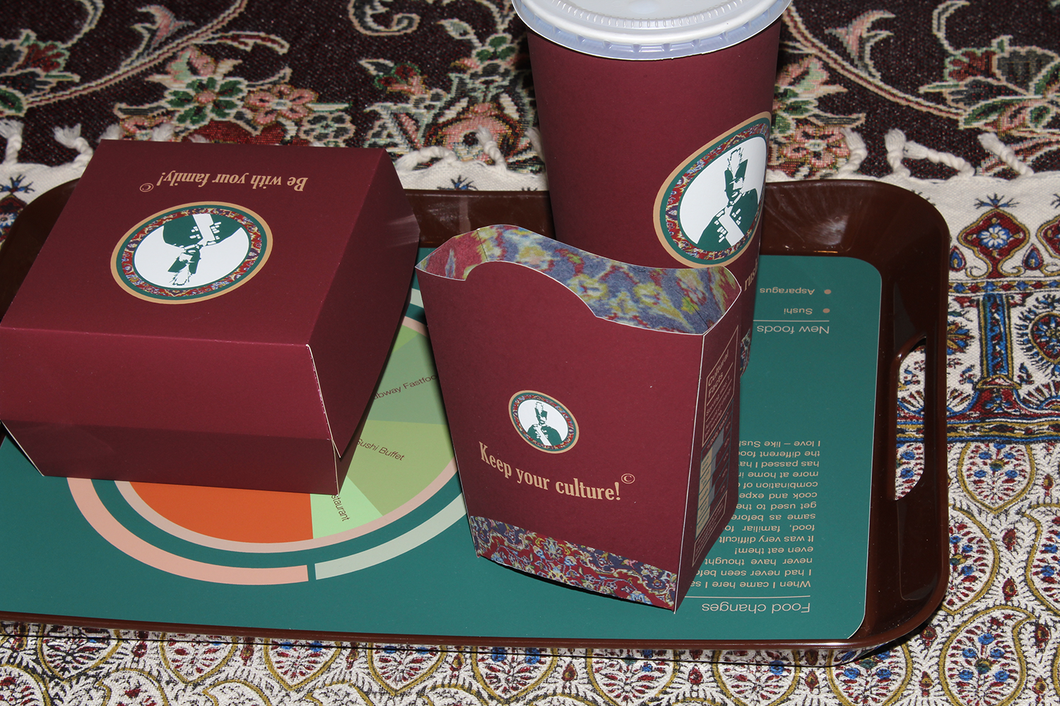 McTradition focuses on food topics, because food and eating are fundamental to culture and bring the commonalities and distinctions of people across the world to light. A new set of American fast food packaging represents a mash-up of cultures, based on contemporary Iranian culture’s extreme interest in westernization and my own personal life in the United States. Four sets of fast food packages are placed on a large Persian rug. The set is designed for four people to symbolize a family sitting together for a meal. I wanted to show that being with family is one of the cornerstones of Iranian culture. I created in the gallery a traditional Iranian dining room where meals are often taken sitting on the floor. Hamburger and French fry packaging and a drink cup are placed on a plastic fast food tray with a paper liner and then placed on a tablecloth on the floor.