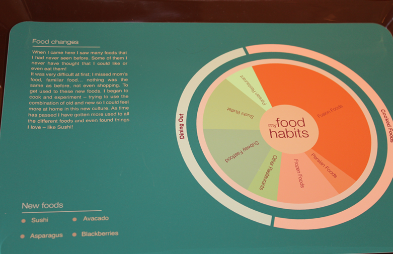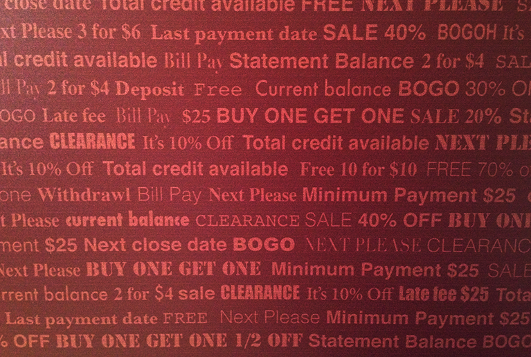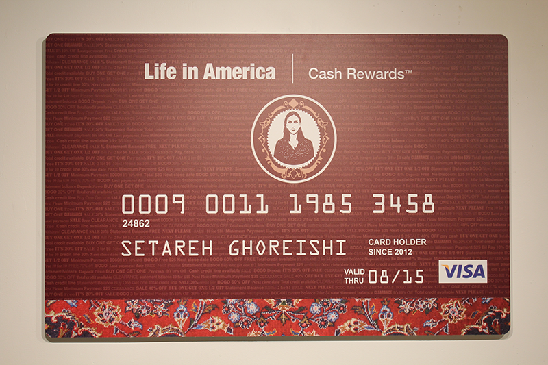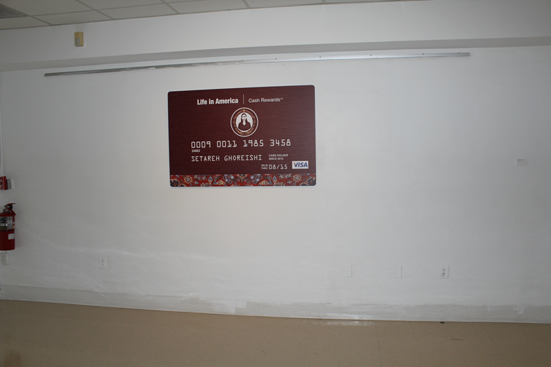 The second part of the exhibition is about my personal experience with the shopping system in the United States. As a person new to this country, who was fascinated by this issue and tends to go shopping a lot, I see how one can be absorbed by capitalism and become caught up in the materialism of society. I endeavored to display my challenges with spending money through the creation of a work entitled Shopping Spree. Shopping Spree is a large (36x55 inches) facsimile of a credit card printed on rigid plastic and hung on the wall. It is designed with the same Persian branded motif as the fast food packages. Text of common phrases used to promote spending more money, create the visual background of card. My face is used as a logo in the middle of credit card along with my personal information including name, date of birth, the date of my entrance to the U.S., and the valid date that I can stay in America during my studies. This project is an attempt to convey the message of multiple cultural influences in terms of my personal experience.
